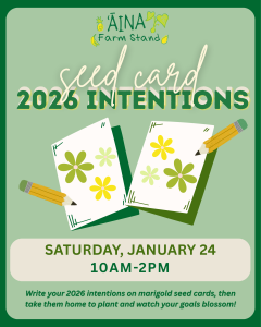 Set intentions for the new year and join us for our first activity of the year at the ʻĀINA Farm Stand on Saturday, January 24 from 10am-2pm! Write down your 2026 dreams, goals, and intentions on seed paper made with seeds from the Kōkua Learning Farm. Then, take them home to plant and watch them blossom throughout the entire year.