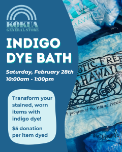 $5.00 donation per item dyed, with 100% of proceeds supporting Kōkua Hawai’i Foundation. We kindly ask you bring no large or dense items to dye, such as bedsheets, towels, or sweatshirts.