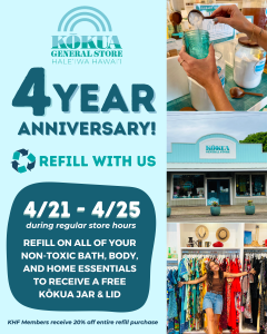 The Kōkua General Store turns four! 🎉 April 22 marks another year of providing our community with everything they need for their zero-waste journey. To celebrate, stop by the Kōkua General Store to refill your non-toxic bath, body, and home essentials during regular store hours from Tuesday, April 21 to Saturday, April 25* to receive a free 16oz Kōkua jar & lid!