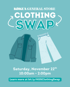 Join us in the Kōkua General Store on Saturday, November 22 from 10am-2pm to swap your gently-used clothes for some ʻnew’ preloved clothes from the community!