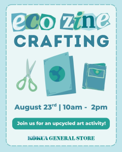 Explore the fun art of zines on Saturday, August 23rd! We’ll have paper and secondhand magazines to turn into special creations through drawing, coloring, and collage-making. This is a hands-on way to be crafty while repurposing old materials. Drop in anytime between 10:00am-2:00pm for this free, keiki-friendly activity.