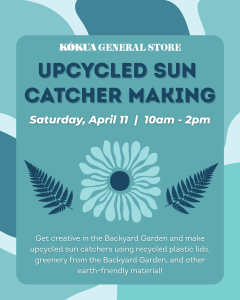 The Kōkua General Store is hosting events all month long to celebrate Earth Month! Mark your calendars for Saturday, April 11 from 10am-2pm to get creative and make upcycled sun catchers. Reuse plastic lids along with herbs & greenery from the Backyard Garden to create unique sun catchers for your home or to gift a friend!