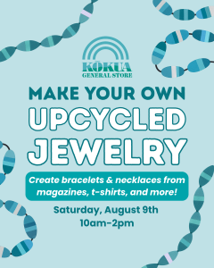 Swing by the store on Saturday, August 9 between 10am-2pm for a fun, keiki-friendly craft! Together, we’ll transform scrap, pre-loved materials into handmade jewelry. Create colorful paper beads from old magazines and add to string made from secondhand t-shirts. Design your own necklaces and bracelets while reducing waste!