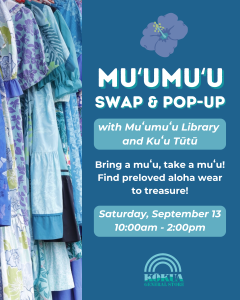 Join our Muʻumuʻu Swap and Pop-Up on Saturday, September 13th from 10:00am–2:00pm! We’re partnering with Muʻumuʻu Library to host a unique swap dedicated to sustainable, local fashion. For day-of swapping, bring muʻu that are made in Hawaiʻi or handmade & in good condition (no major holes, rips, or stains). Then, browse their swap racks to discover “new” mu’us to take home!